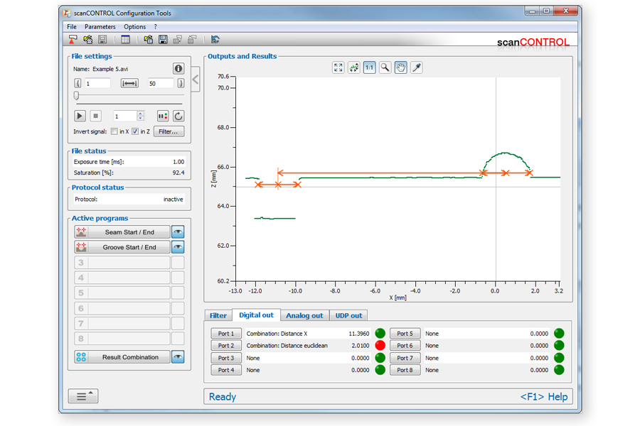 Eén profiel bestaat uit maximaal 1280 gekalibreerde meetpunten, afhankelijk van het sensortype. Deze profielen worden via FireWire of Ethernet naar de pc verzonden. scanCONTROL Configuration Tools bieden de mogelijkheid deze profielen in realtime weer te geven of op te slaan. Met name voor zeer snelle processen is dit een absoluut noodzakelijke functie, omdat het ook mogelijk is om de profielen opnieuw te laden en vervolgens stap voor stap te analyseren. Voor nadere analyse is het ook mogelijk de profielen te exporteren naar een formaat dat compatibel is met MS Excel.