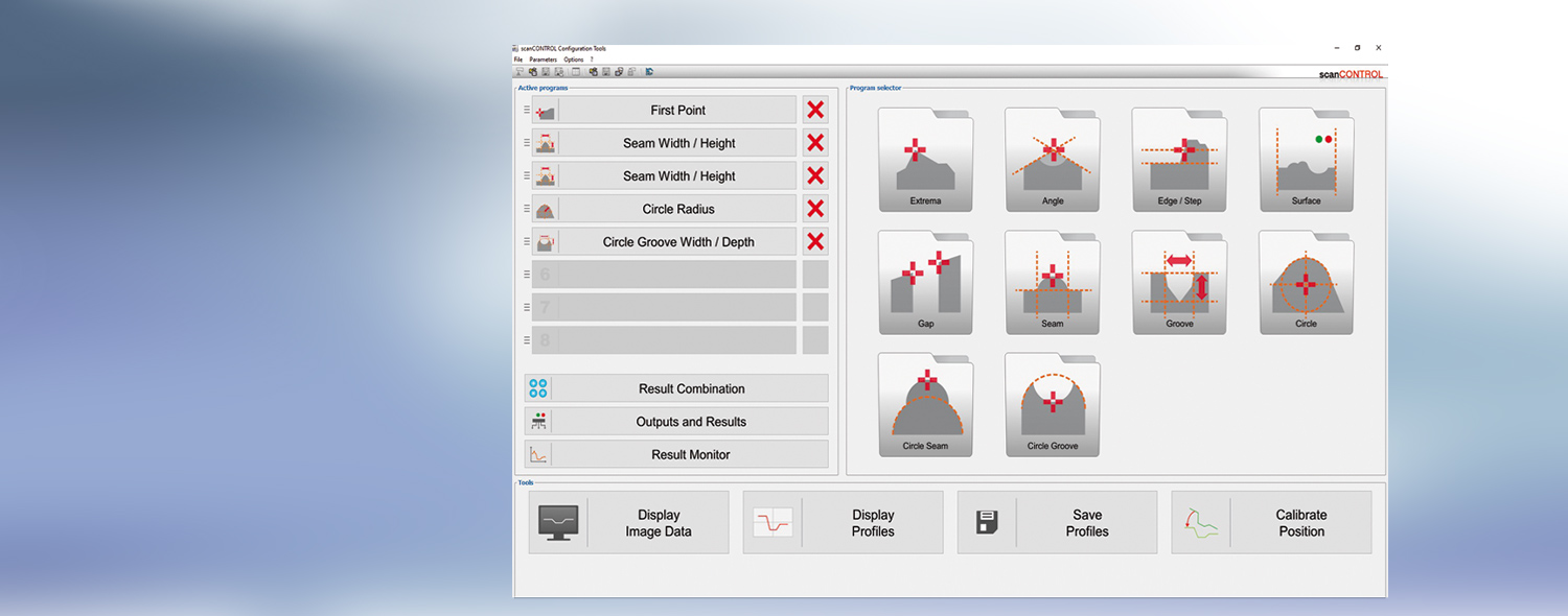 In combinatie met scanCONTROL SMART-sensoren toont de Configuration Tools software zijn ware kracht. De software parametriseert complexe meettaken, inclusief alle uitgangen via de bijbehorende interfaces.