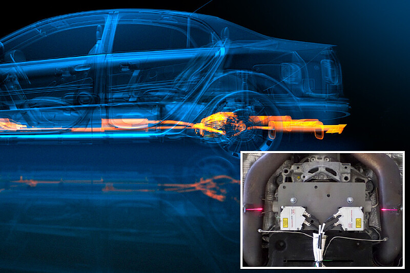 During the road test, powerful laser profile scanners and miniaturized laser sensors record lowfrequency vibrations and the movement of components within an assembly space. They test, for example, how assemblies move while driving or how the envelope curve of an exhaust system or cardan shaft is represented.