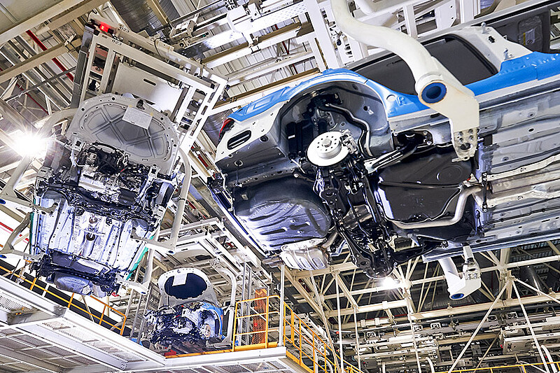Before a car emerges from a bodyshell, it passes through numerous stations within the production, in which fully automatic processing steps are carried out. In order to enables the processing robots to recognize the exact position of the car body, several laser triangulation sensors measure the car body and transmit the position data to the robot controller.