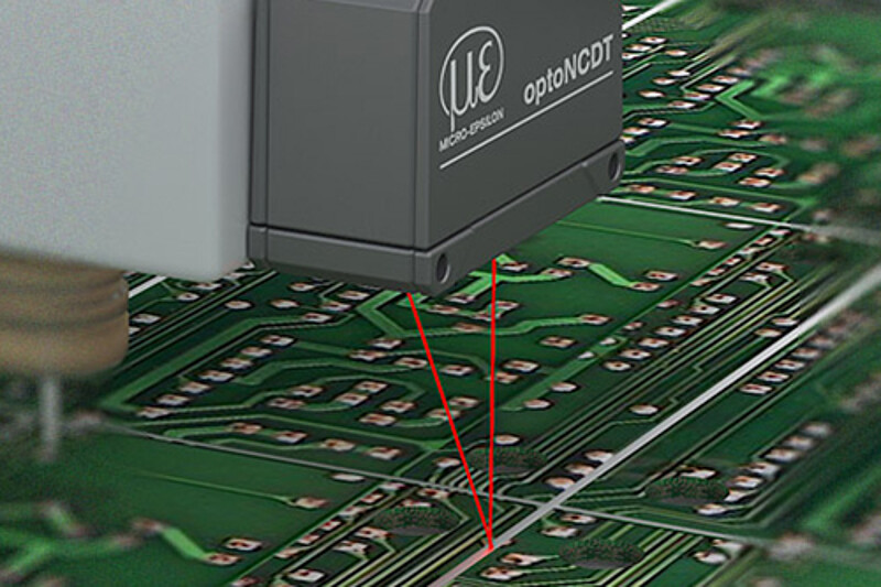 Scribe lines are pressed into printed circuit boards for separation purposes. Laser sensors inspect the line depth which should be consistent in order to ensure reliable separation.