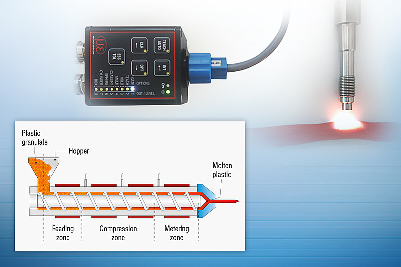 When extruding solid to viscous masses, the materials must not be allowed to heat up too much. This would lead to burning and therefore undesirable coloration. The precise colorSENSOR CFO sensors measure the color of the materials directly in the extruder. In the case of transparent materials such as gelatin, the measurement is carried out in transmission, while opaque materials such as plastic are measured using the reflection method. One or two special sensors CFS4-T150-P200 are installed directly in the extruder with either a transmission sensor CFS3-S-T250 or a reflection sensor CFS4-S-T250. The measurement takes place on the inside wall of the extruder, at up to 200 bar pressure and up to 250 °C. The results are then used for process control.