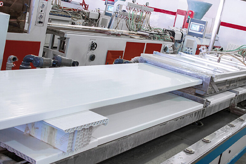 colorSENSOR CFO200 sensors combined with the CFS3-A20 transmission sensor from Micro-Epsilon are used for this quality inspection. The measurement on the sheets takes place directly after cooling in the production line. The distance between the transmitter and the receiver units is 80 mm. During the production process, the intensity distribution and the color differences are precisely detected. If the color of a plastic sheet deviates from the setpoint, the controller transmits the signal to the plant control system via Modbus TCP.