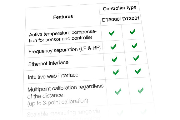 De DT3061/3071 controllers bieden verbeterde functies zoals 5-punts kalibratie, schakel- en temperatuuruitgangen, plus de opslag van meerdere karakteristieken. Omdat de eddyNCDT 3060/3070-systemen zijn uitgerust met een innovatieve frequentiescheidingsfunctie, is synchronisatie bij meerkanaalsmetingen niet nodig.