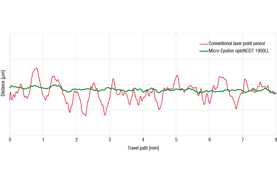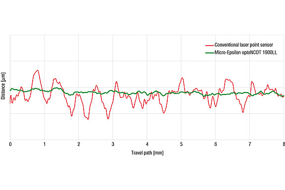 De optoNCDT LL-lasersensoren produceren een ovale lichtvlek van slechts enkele millimeters breed, die doet denken aan een korte "laserlijn" (LL). Deze ovale lichtvlek compenseert inhomogene oppervlaktestructuren en het zogenoemde "spikkeleffect" dat met name bij metalen oppervlakken optreedt. In combinatie met speciale software-algoritmen worden storingen veroorzaakt door oppervlakteruwheid, defecten, deuken of gaten uitgefilterd. Dit zorgt voor stabiele en nauwkeurige meetresultaten.