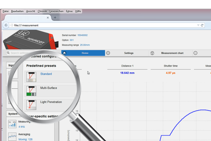 Alle optoNCDT 1420-modellen worden via een intuïtieve webinterface bediend. Voorinstellingen en een kwaliteitsschuifregelaar voor de selectie van de meettaak maken het instellen van de sensorparameters mogelijk. Tot acht gebruikerspecifieke sensorinstellingen kunnen worden opgeslagen en geëxporteerd in het instellingenbeheer. Instellingen kunnen snel en eenvoudig worden opgeslagen, geladen en overgedragen naar andere sensoren. De videosignaalweergave, de signaalpiekselectie en een vrij instelbare signaalmiddeling maken het mogelijk om de meettaken verder te optimaliseren. De ROI-functie (Regio of Interest) maakt het bijvoorbeeld mogelijk om storende signalen op de achtergrond uit te filteren. De multifunctionele knop maakt een snelle inbedrijfstelling van de sensor mogelijk.
