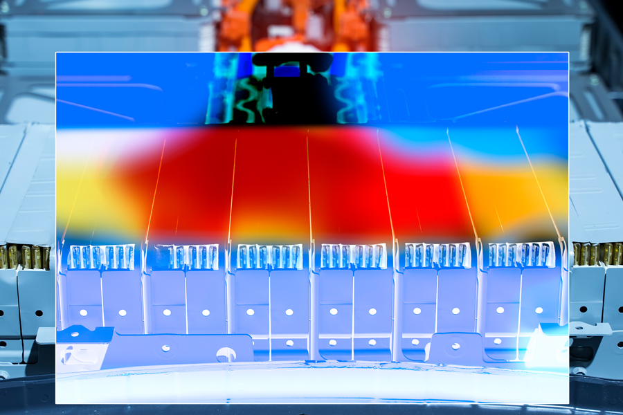 Especially during initial charging, temperature development is a decisive parameter and is therefore monitored using thermal imaging cameras. These provide an insight into the temperature distribution and possible short circuits. The thermoIMAGER thermal imaging camera is designed for demanding industrial serial applications. The powerful software monitors hot and cold spots automatically and outputs measured values to a control unit. The camera is able to focus on and monitor up to three measuring fields simultaneously on a continuous basis.