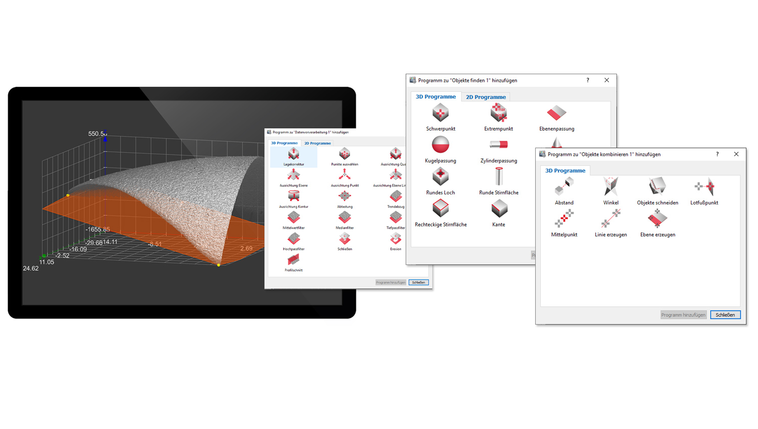 The measurements are performed automatically with the thicknessGAUGE 3D. This requires a configuration file, which is provided by Micro-Epsilon and imported into the thicknessGAUGE 3D. You can create your own or multiple configuration files using the optional 3DInspect software. Any parameters can be selected in this software and many measuring object geometries can be configured for the subsequent calculation. Powerful tools in the software also allow the alignment and filtering of the point cloud, the intuitive detection and selection of relevant areas and the combination of programs.